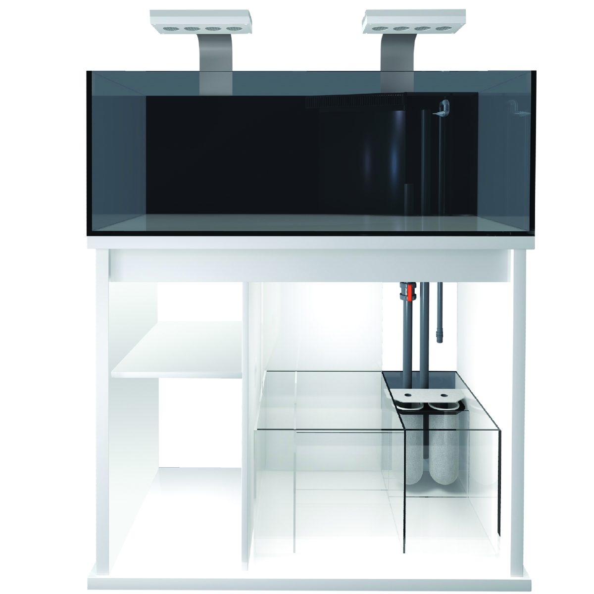 Kristallklares, rahmenloses Weißglasbecken mit vollständig polierten Kanten für einen ungetrübten Blick auf Ihr Riff. Ausgewogenes Verhältnis von Breite zu Höhe, um die Sicht und die Gestaltung eines natürlichen Riffs zu erleichtern. Einzigartiger Überlaufschacht aus laminiertem, schwarzem Glas, welcher an die Rückseite des Aquariums quasi unsichtbar ist.